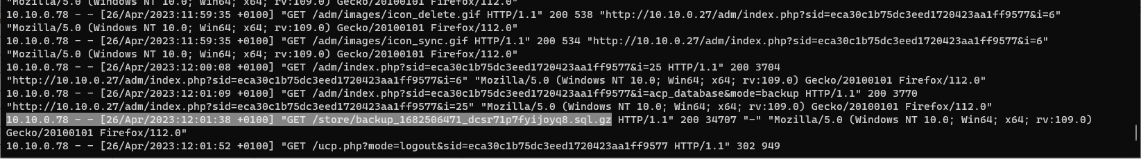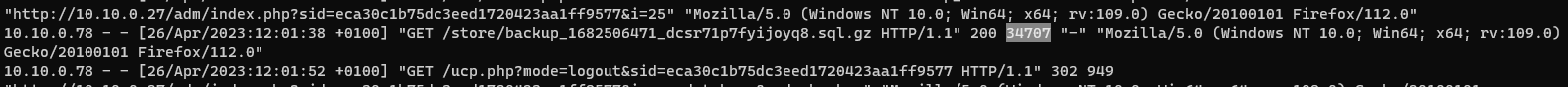 Knowing when the contractor started the database backup from the phpbb_log table, we look at the access.log file for traffic coming from the contractor’s IP around the time when the database backup was started. To do this, we run the PowerShell command: