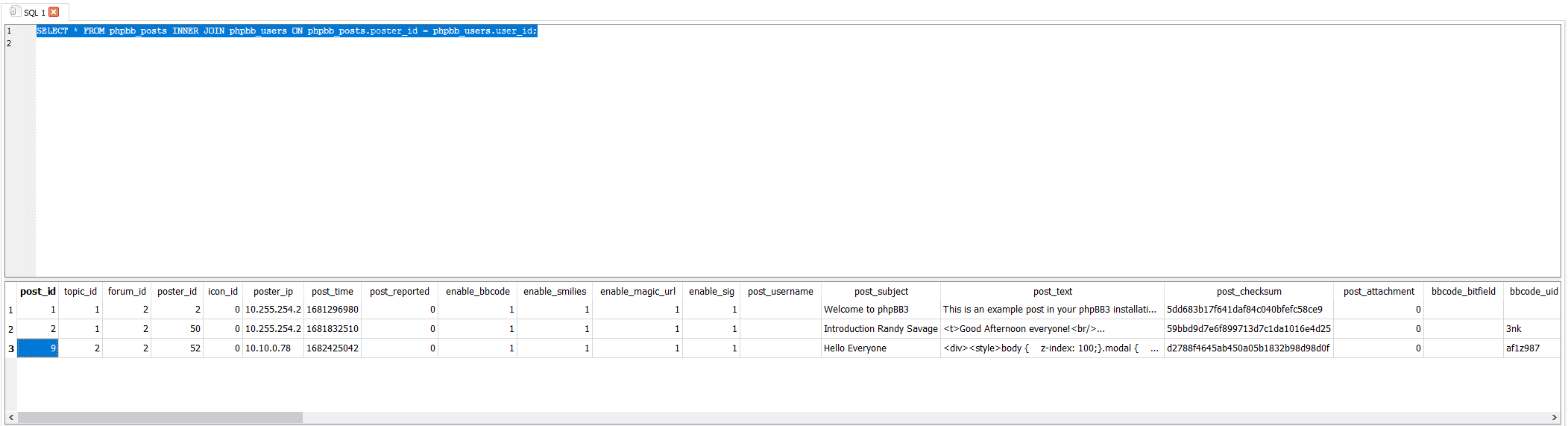 After running the SQL query, the results show 3 posts, one of which, done by our contractor, contains a bunch of code in the post text. The post_id of this post is 9.