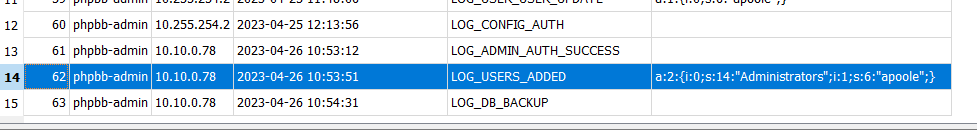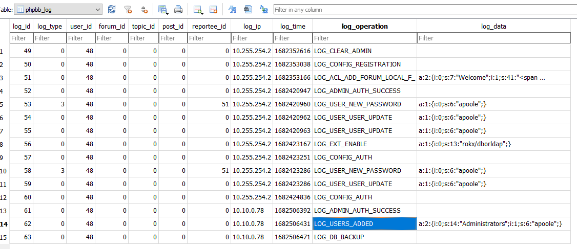 Searching throught the tables in the database we find the phpbb_log table. The table contains a list of logs various operations conducted by users. There is an entry for LOG_ADMIN_AUTH_SUCCESS which is particularly interesting.