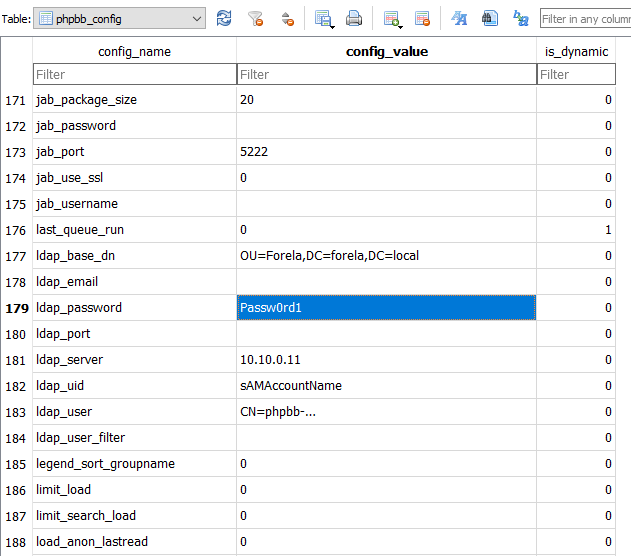 To find the LDAP credentials, we check the phpbb_config table. This table is a flat key-value table, so we just have to look for the config_name related to LDAP. We find several config names referring to LDAP but only one for the password.